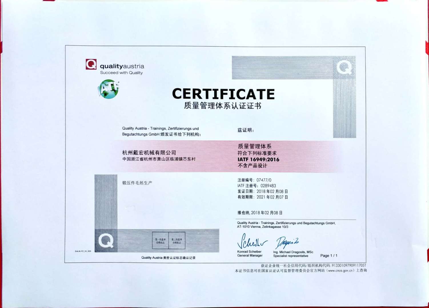 公司通過了IATF16949:2016質(zhì)量體系認證,產(chǎn)品執(zhí)行標準為GB12362,出廠產(chǎn)品能夠保證產(chǎn)品質(zhì)量,能充分滿足用戶期望。